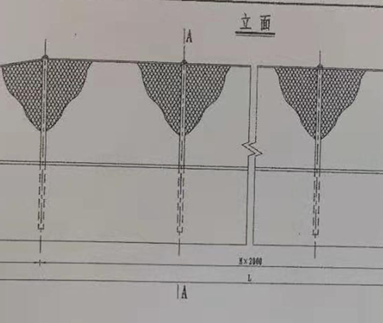 2.各片编织网挂上后,断开端部应用12号铅丝串连起来成为整体。