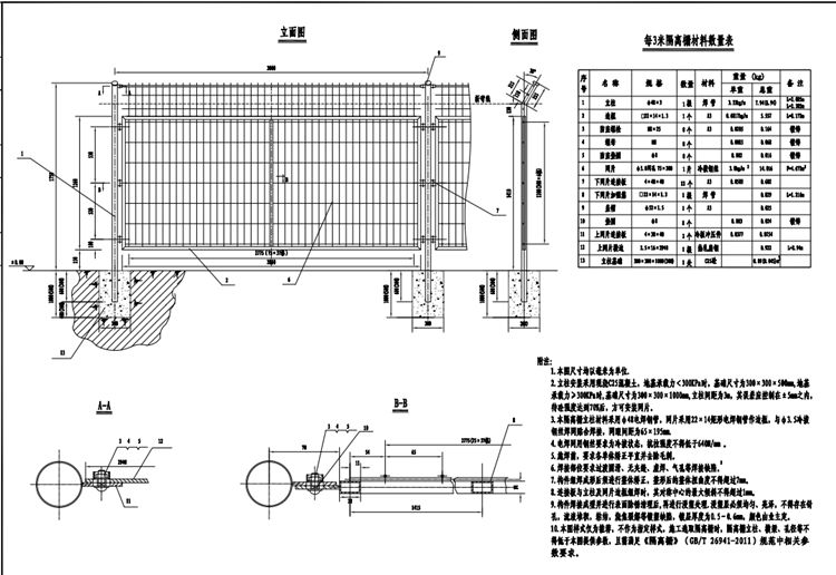 3、基础部分根据各地区地质地貌的结构和复杂程度的差异,施工的过程中要针对不同地质状况实施专业技术,基础部分根据实际情况,一般地质如粉土,沙土等,地基承载力<300KPa,采用300×300×1000 的基础,以达到其基础的稳定;特殊地质如山区段,地基承载力≥300KPa,采用300×300×500 的基础。说明中隔离栅样式及参数仅为推荐,不作为指定样式,施工选取隔离栅时,隔离栅立柱、横梁、孔径等不得低于本图提供参数,且需满足《隔离栅》(GB/T 26941-2011)规范中相关参数要求。