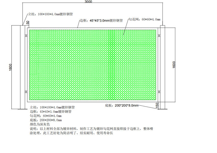 1、立柱规格100*100*4.0mm镀锌钢管。