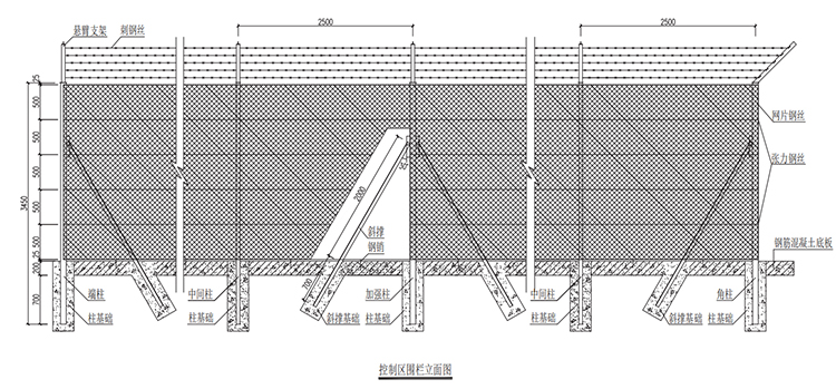 1、立柱包括端柱、角柱、加强柱和中间柱,均采用 Q235B 级钢。端柱、角柱、加强柱采用80x80x3mm 方管立柱,中间柱采用90x50x3mm矩管柱。立柱的任一截面,其平行与围栏轴线的截面模数应大于 15cm。立柱总高度3.45m,每根立柱均应埋入混凝土基础中 0.9m。柱间标准间距为2.5m,两根加强柱之间的最大距离为50m。