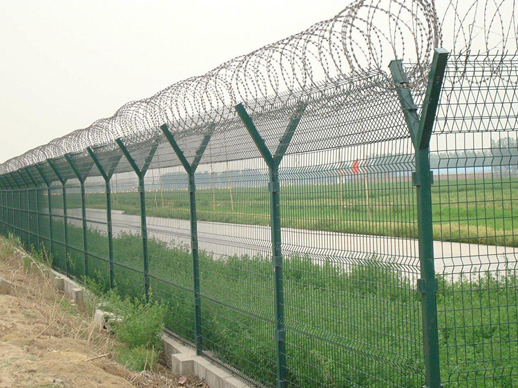 4、双向延伸臂(V型)顶端设置刀片刺丝圈,刀片刺丝圈由两根弹簧钢丝组成,两丝之间以钢片强力夹扣连接,钢丝上焊接有不锈钢刀片。刀片刺丝圈直径为0.7m,间距为0.6m.钢丝和强力夹均采用热浸镀锌,单面平均镀锌层附着量分别为250g/m和350g/m