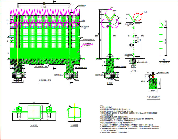 2.钢筋网刺铁丝围界基础及地梁采用现浇方式,其余采用成品构件安装。