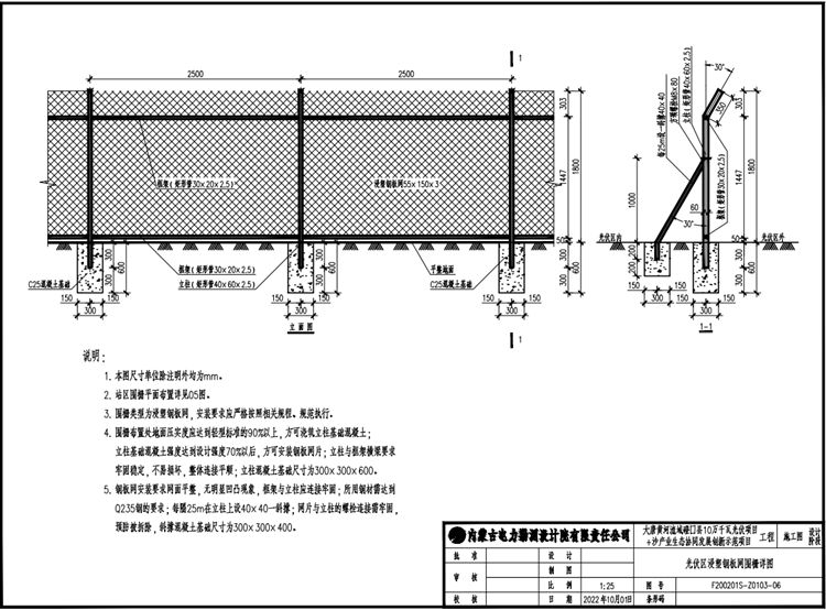 4.光伏电站隔离栏布置处地面压实度应达到轻型标准的90%以上,方可浇筑立柱基础混凝土;立柱基础混凝土强度达到设计强度70%以后,方可安装钢板网片;立柱与框架横梁要求牢固稳定,不易损坏,整体连接平顺;立柱混凝士基础尺寸为300x300x600。