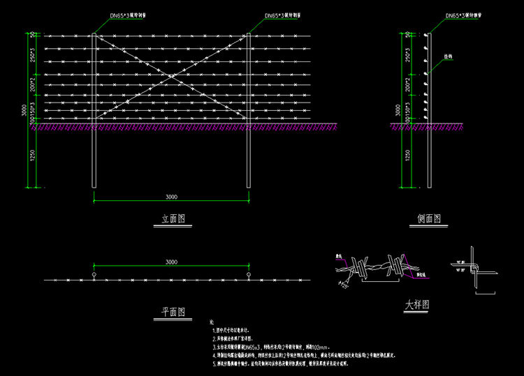 3.刺铁丝隔离栅立柱采用镀锌圆管DN65x3,刺铁丝采用12号镀锌钢丝,刺距102mm。