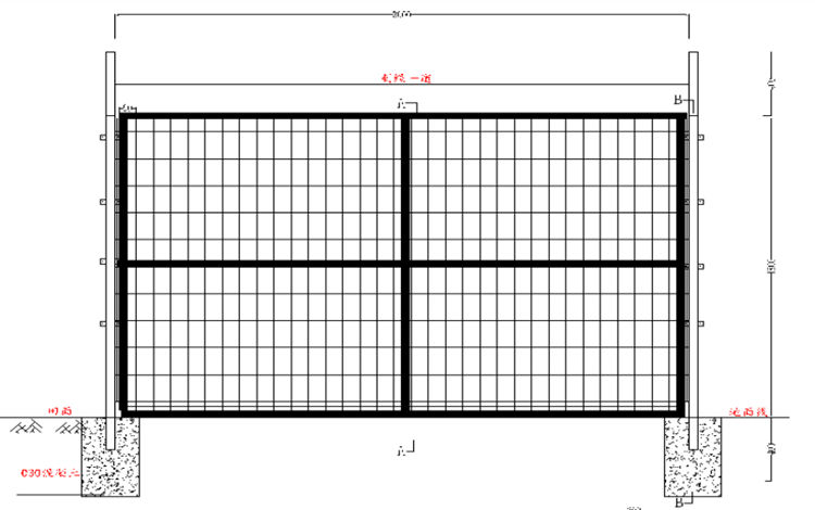 结合当地实际情况,依据《高标准农田建设通则》(GB/T30600-2014),本次项目布设防护网,防护网网片规格为3m*1.8m成品冷拔低碳钢丝焊接网片(孔径50mm*100mm,丝径5.0mm),立柱高2.2m(为48mm*2.5mm*2200mm钢管),立柱顶端盖有塑料盖或防雨帽,在立柱上面设计一道刺绳,立柱基座为0.3m*0.3m*0.5m,埋入地面0.4m,采用C30现浇混凝土,在网片四周增加边框,在网片中间增加十字加固边框,通过在立柱上和网片上焊接连接件,用螺丝将连接件固定在一起。为方便村民通行方便,设计防护铁门,规格为3m*1.8m,铁门与立柱之间通过焊接连接件用螺丝将其固定。