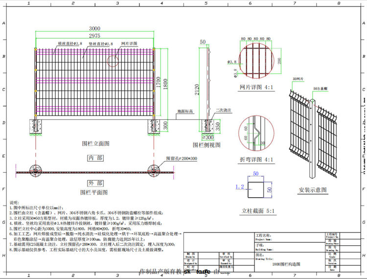 5.浸塑围栏立柱中心距为3000,安装高度为1800,网格80*200,折弯30*60;