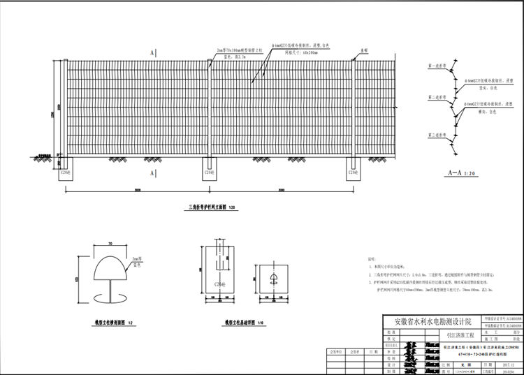 3、引江济淮工程铁丝网围栏网片采用Q235低碳冷拔钢丝焊接后经过液压成型,钢丝采取浸塑防腐处理,护栏网网片网格尺寸60mmx200mm,2mm厚桃型钢管立柱尺寸: 70mmx 10mm,高2.3m。