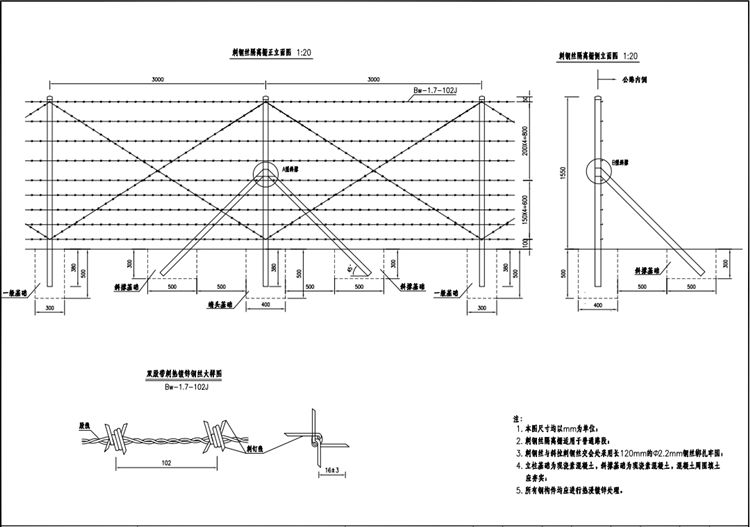 6、刺钢丝隔离栅的立柱间距为3.0m,两个双向斜撑间距为30m。两个三向斜撑间距为90m,凡拐角处均应设置单向斜撑;