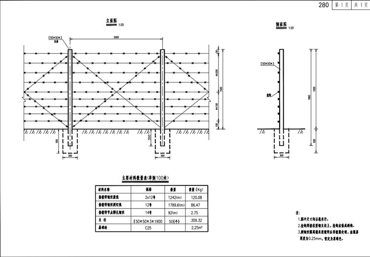 3.刺钢丝隔离栅采用镀锌后再镀塑处理,涂塑层厚度为0.25mm,暂定为果绿色。