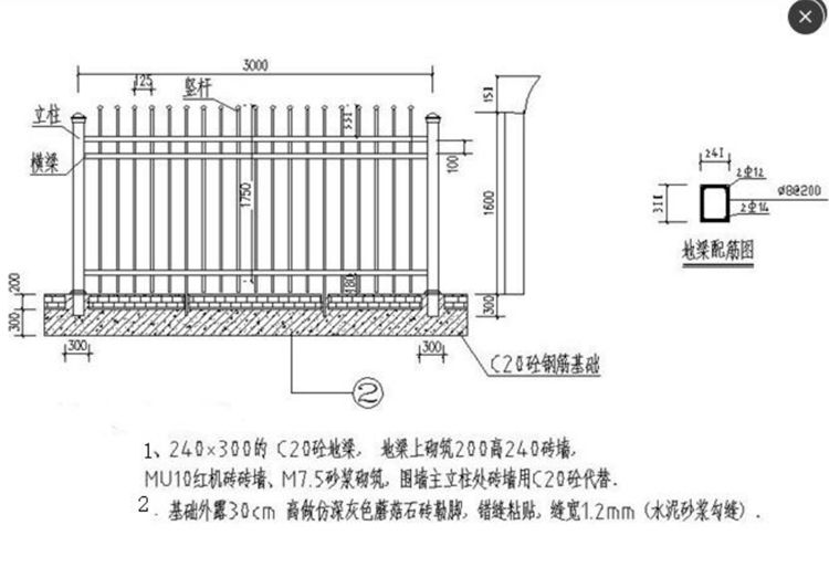 4 、锌钢护栏围栏尺寸:主立柱高为 1.6 米(底边到帽尖), 利用三根横梁加固,单片围栏中心距为 3 米,竖条间距不得 大于 125 mm,外加防爬垂直高度 1.75 米。