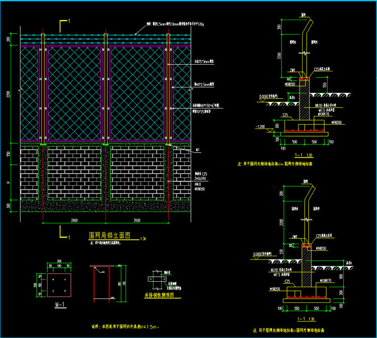 3、上部:横排列三根带刺铁丝网,每根间距0.1米或高为0.3米的金属网。