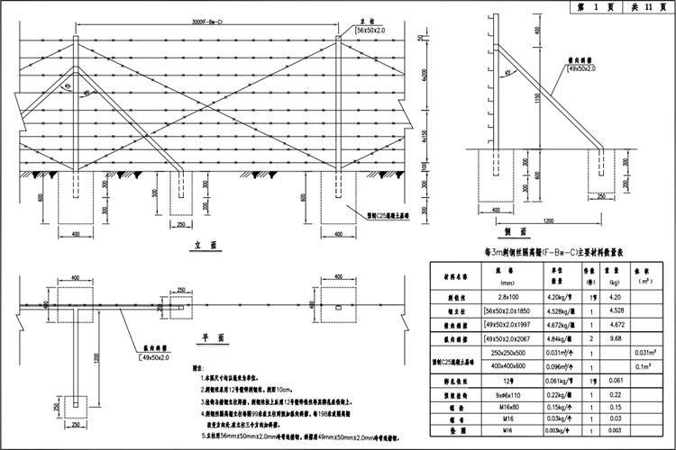 本图尺寸均以毫米为单位。刺钢丝采用12号镀锌刺钢丝,刺距10cm。挂钩与槽钢立柱焊接,刺钢丝拉上后用12号镀锌铁丝将其绑扎在铁钩上。刺钢丝隔离栅立柱每隔99米在立柱两侧加纵向斜撑,每198米或隔离栅改变方向处在立柱三个方向加斜撑。立柱用56mmx50mmx2.0mm冷弯边槽钢,斜撐用49mmx50mmx2.0mm冷弯边槽钢。剌钢丝隔离栅立柱采用56×50×2.0×1850槽钢热镀锌喷塑防腐处理,钢构件镀锌量为275g/㎡,涂塑层厚度大于76μm。