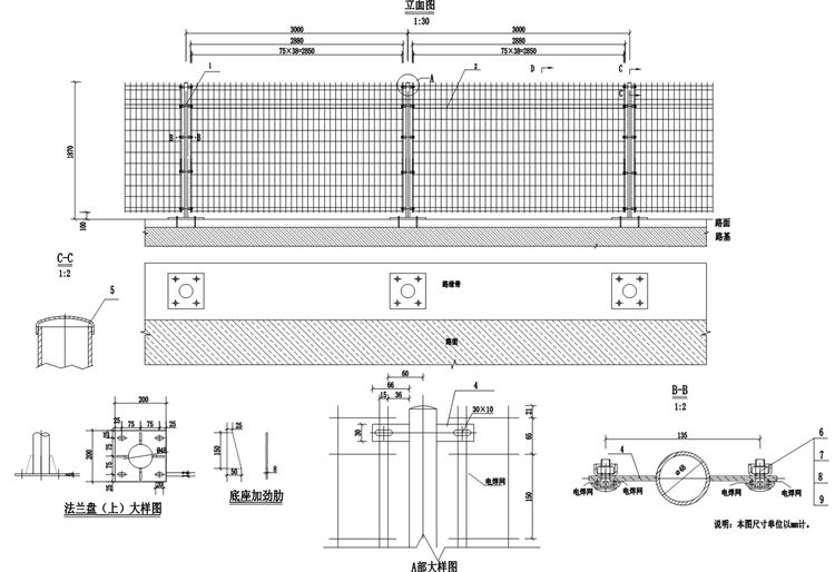 4.F-Ww-C焊接网隔离栅每隔24m间距设置一个斜撑,在F-Ww-C焊接网隔离栅改变方向的地方和端头应设斜撑,或两侧加斜撑。